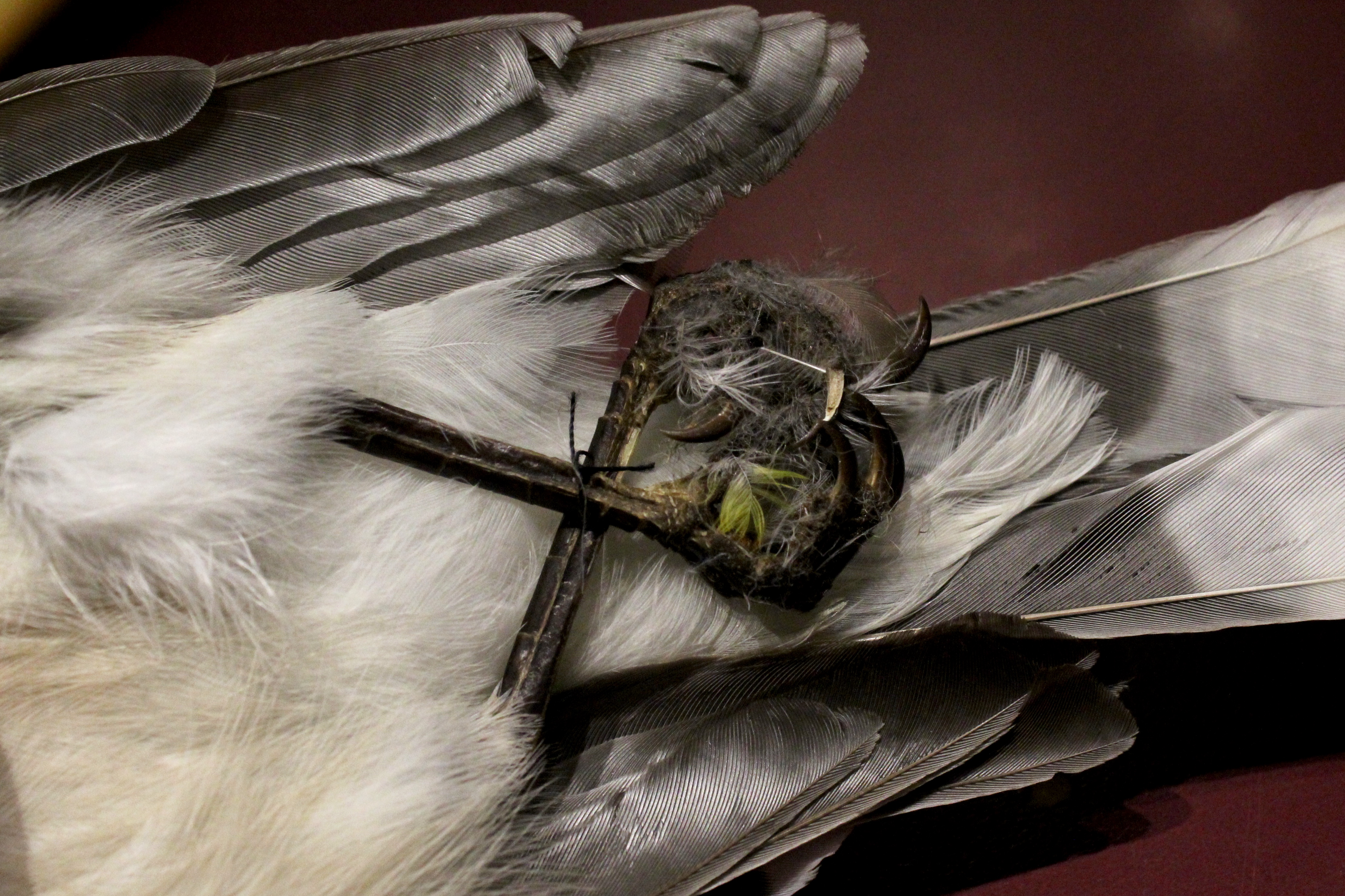 The leucistic secondaries aren’t the only interesting thing about this bird, actually. The feet have several tiny, yellow feathers stuck to them. While it’s difficult to positively identify small songbird feathers, I would guess that they’re goldfinch or warbler feathers. The real mystery here is how they got there, and without an information tag or background on this specimen’s preparation, that’s even farther outside my solving abilities than the whole leucism thing. Most likely, though, this happened due to poor storage. Prepared bird specimens commonly retain a lot of “grease” in their feet, which soft materials like feathers easily get stuck to.