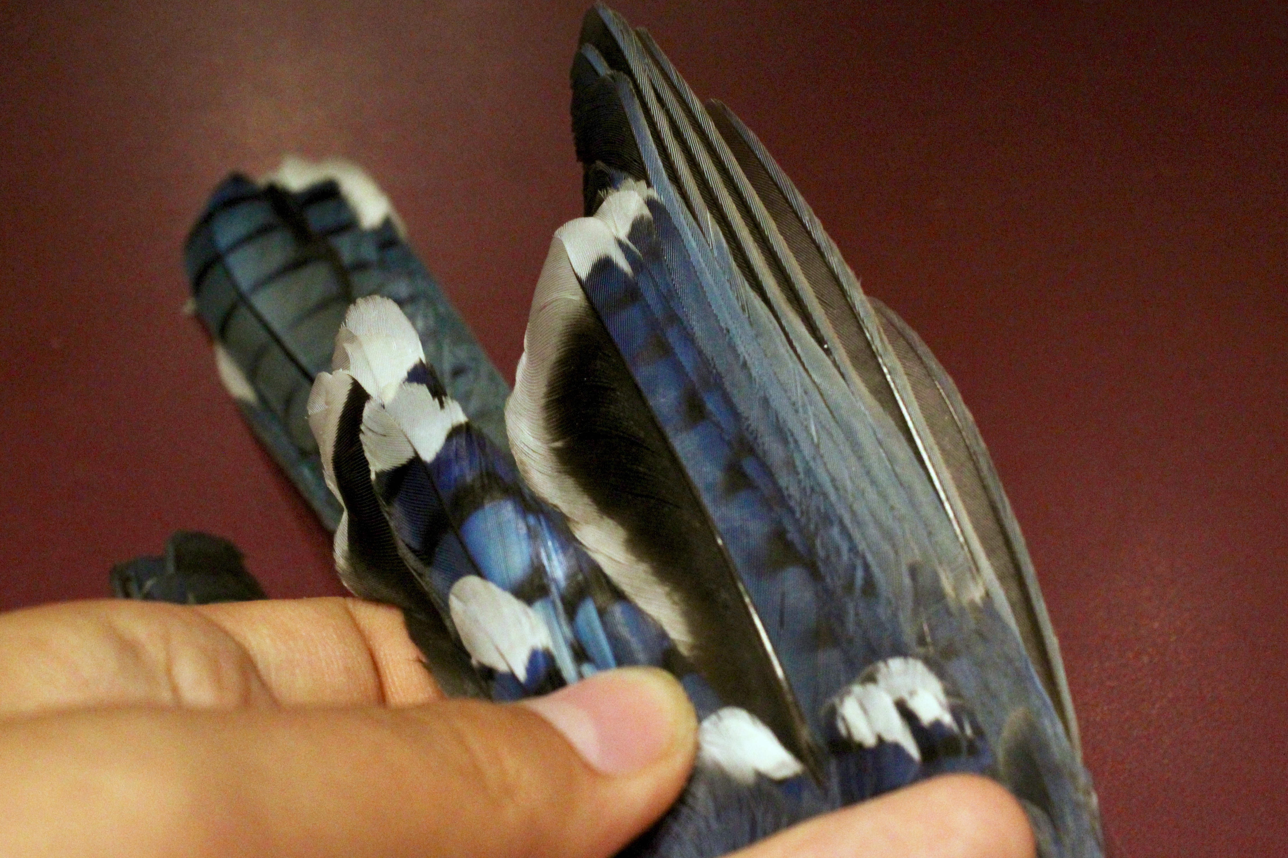 Earlier this week, I came across a very interesting Blue Jay specimen while doing a presentation at the Delaware Museum of Natural History. These presentations usually entail me choosing several of the awesome specimens in the education collection (i.e. toucan bills, pheasant tails, and owl wings) and then pointing out their unique traits and adaptations. This Blue Jay study skin is just one of many in the collection.