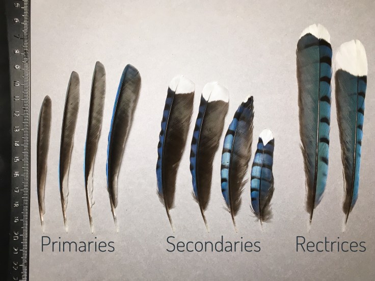 Now, Blue Jay wing feathers do typically have white patches on the tips of their secondaries and the bases of their primaries, as seen in this group of Blue Jay feathers (from a single individual) that I found in Georgia: